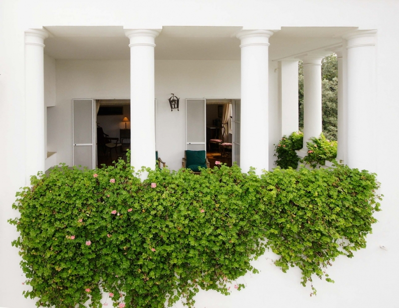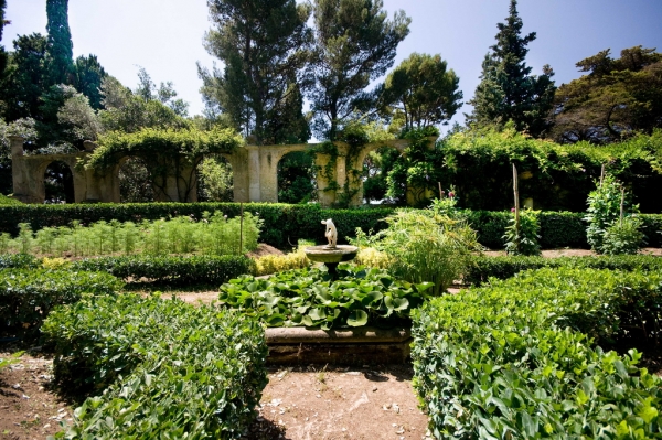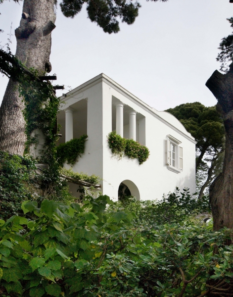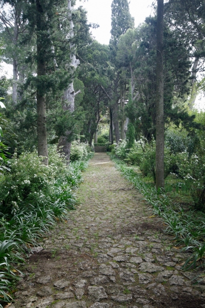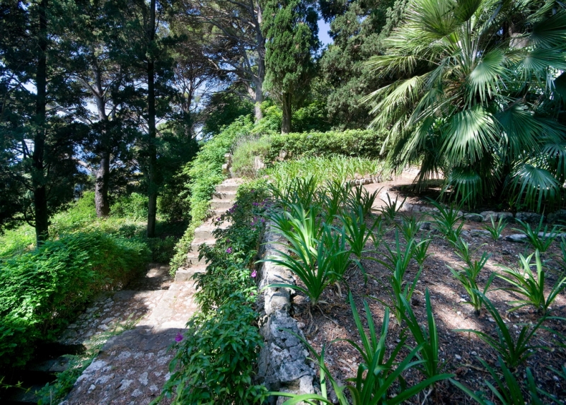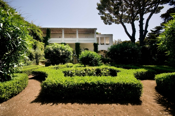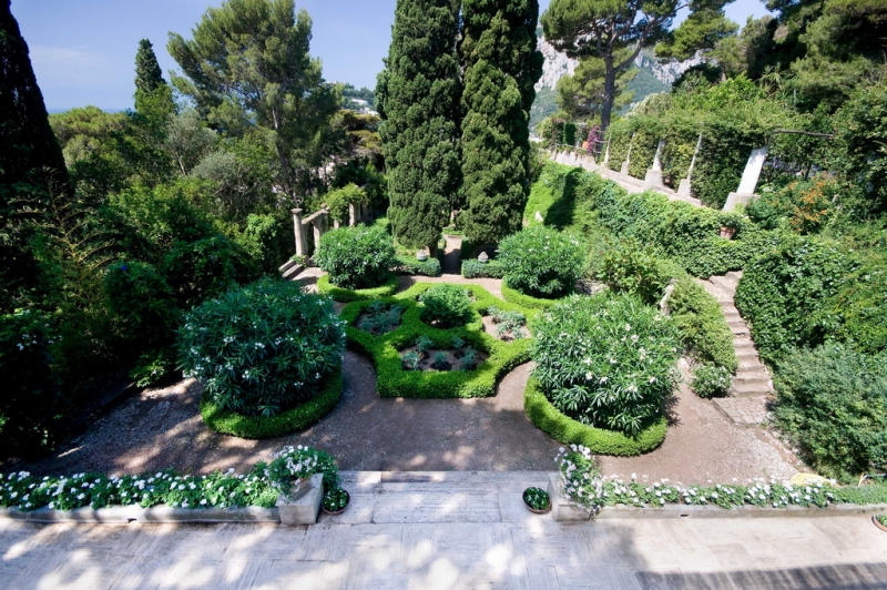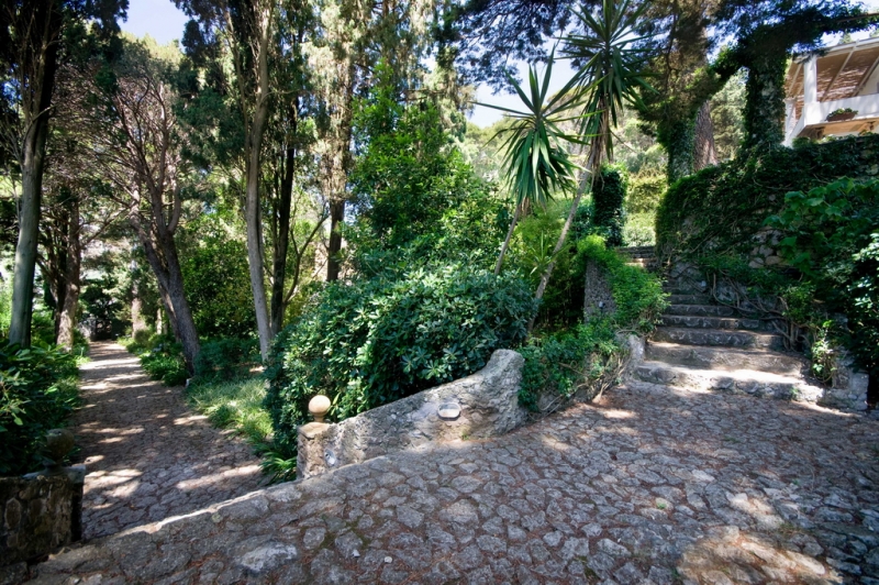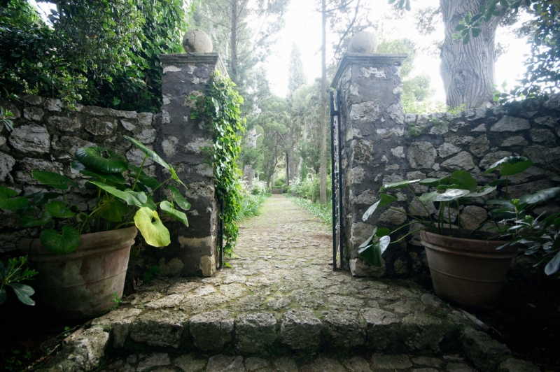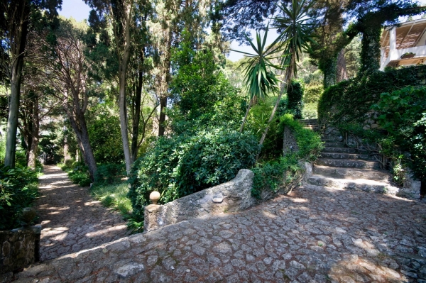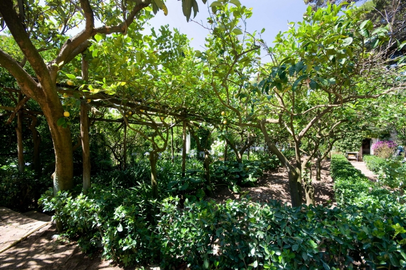 The garden, which spreads all around the house, continues up a hill, covering an area of 7 hectares, encompassing the entrance driveway which was formed from an ancient Roman chariot path. The landscape of this magic garden was created in 1894 and is characterized by shady pine trees, roses, grape vines, olive terraces, columns, and even a neo-Greek temple. It’s the largest garden on the Island of Capri and has a spectacularly Italian layout in a Rinascimento style. A true ruin, a Napoleonic fort, is located at the top. A path of approximately 100 steps along a walk leading by a fountain, leads up to the hill of Mount San Michele, to the very top of the mountain, which boats a 360 degree panorama of the much varied landscapes of the entire island, offering glorious views towards the Bay of Naples and Mount Vesuvius. The walk to the top of the mountain slope is constantly full of surprising angles and places. On top of the hill you will find a florid lemon garden.