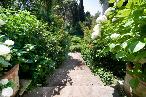 14 steps lead up to the main entrance gate and an alleyway leads through a luxurious garden among tall pine trees and cypress trees. From here, 21 steps take you up to the main terrace, in front of the villa. Right in front of the house is the Italian style garden with flower beds planted with white roses and oleander trees.