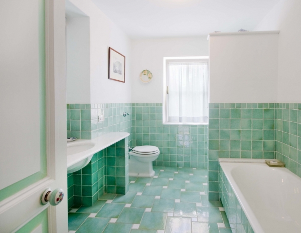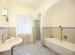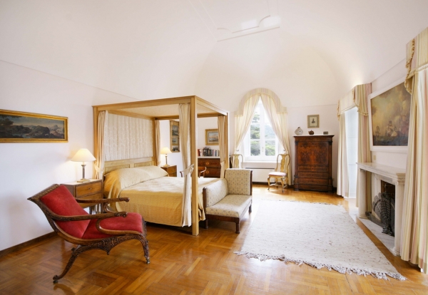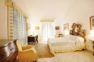 A marble staircase of 20 steps leads up to the first floor where 5 spacious bedrooms and 3 bathrooms are located. The first is a large double bedroom with a double bed and French doors leading out onto the terrace looking out onto the garden. The bedroom is furnished with bedside tables, 2 lamps, antique wooden furniture, 2 armchairs, a wooden writing desk with lamp and mirror, and a wooden closet. A green tiled bathroom with bathtub, shower box with glass door, marble topped desk, and sink is situated in front. The second bedroom enjoys a romantic golden wooden headboard shaped like a sea shell with French doors leading out onto the terrace overlooking the garden. The bedrooms is spacious with a glass topped table, writing desk and chair, armchair, and closet. The 3rd bedroom is a beautiful and large master bedroom with wooden baldachin bed, parquet floors, bedside tables, antique fireplace, dresser, chairs, a chaise lounge and large closet. 2 French doors lead out onto a private terrace overlooking the garden. The bedroom enjoys a blue tiled en-suite bathroom with bathtub and shower box and marble sink. The fourth bedroom boasts twin beds and a small closet and the fifth bedroom has a double bed and small closet. Both bedrooms have French doors leading out onto the terrace overlooking the garden. There is also a third, blue tiled bathroom with bathtub and shower.