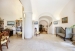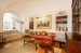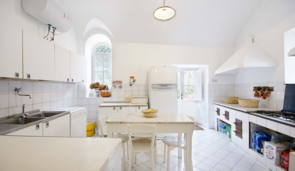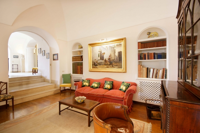 A large marble terrace, with steps descending down towards the garden, furnished with a table and chairs for outdoor dining lies in front of the house. The main entrance door leads into the living and dining area, welcomed by two small Roman statues, which is divided into two different rooms by 4 steps. Both rooms are furnished with pieces of antique wooden furniture and day beds, many of which date back to the 18th century. Both enjoy colourful textiles, antique mirrors, prints and painting all standing in contrast with the white washed walls.