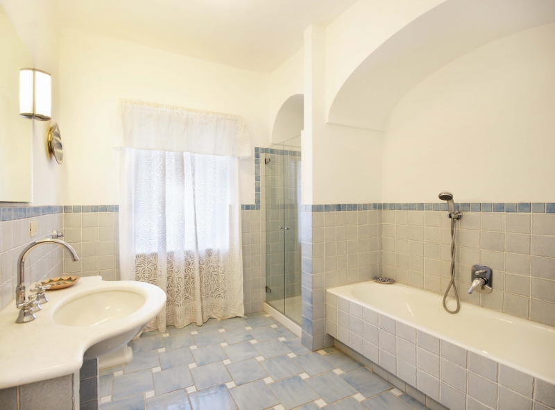 21 steps lead from the villa up along the garden to a wonderful florid lemon pergola, lined by white columns. The path takes you to the terrace where a large irregular shaped pool (12 meters x 5 meters x 1.80 meters deep), is located. The pool is surrounded by palm and pine trees and large potted cactus and is lined by a stone wall covered with violet Bougainvillea. There is an outdoor shower and small changing room. The terrace is equipped with sun lounge chairs and enjoys views of the hillside of Mount San Michele.