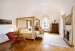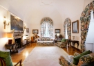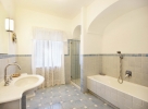 The entire floor has spacious rooms with high ceilings. The dining room, furnished with a library, has a large round wooden table, 6 chairs, and windows giving onto the garden. There is a large living room with parquet floor and oriental carpets furnished with several different sitting areas, each comforted with sofas and armchairs, large mirrors and paintings hanging on the walls and an antique fireplace. 2 French doors lead out onto a terrace. A large, well equipped kitchen built with white tiles boasts a marble topped dining table for 4, refrigerator/freezer, dishwasher, 6 range stovetop, 2 ovens, 2 sinks, and a working wood oven. 1 step down leads into a separate laundry room where a washing machine, sink and, ironing facilities abound. The kitchen has window and a door leading out behind of the house. There is also a ½ bathroom on the ground floor.