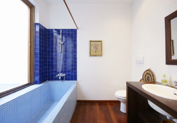 4 steps leads up to the sleeping area: One twin bedroom (on request it can be made up as double) with French windows giving onto the terrace. En-suite bathroom with bathtub. A second, small twin bedroom (cannot be made into a double) with window and shower room just off the corridor. A corridor from the main sitting room leads down to a spacious master bedroom with en-suite bathroom with bathtub and twin bedroom (on request it can be made up as double) with French windows leading out onto the east terrace. This bedroom is served by a further bathroom just off the corridor. Each bedroom has been decorated with attention to detail and is equipped with individually controlled electric heat and air units.